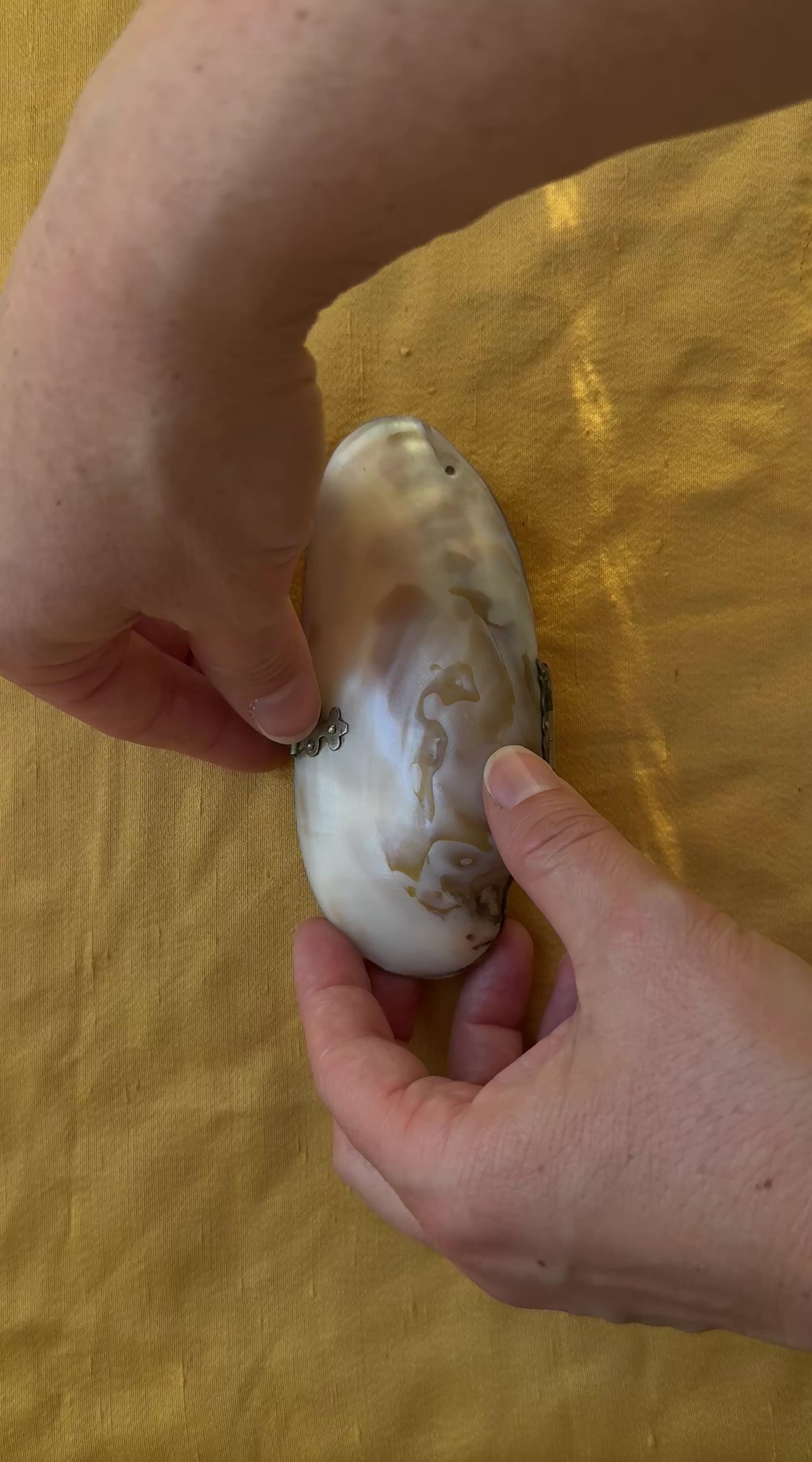 The exterior shell displays luminous, naturally variegated nacre in soft creams, honey, and pearl blush tones. The French brass hinge and clasp are correct for the period and function cleanly.